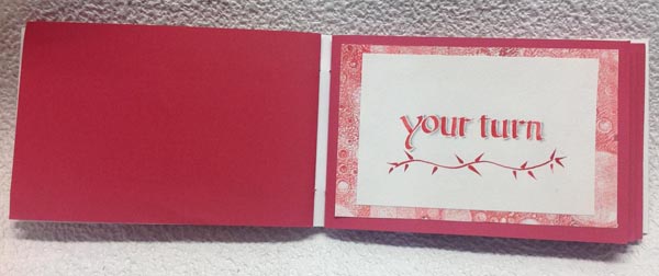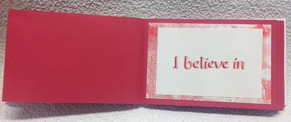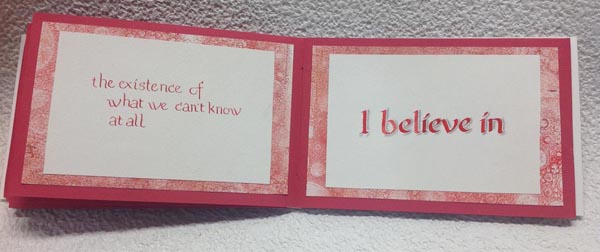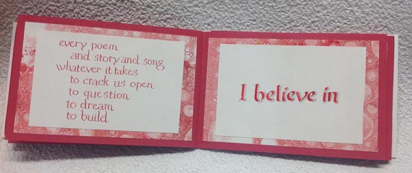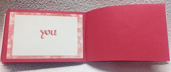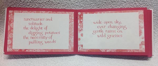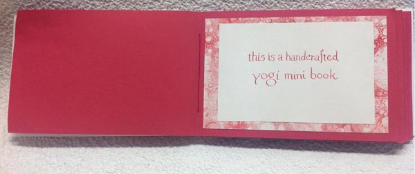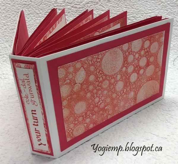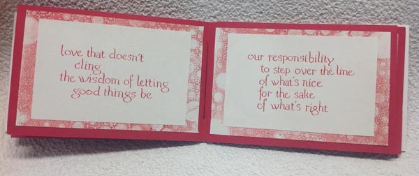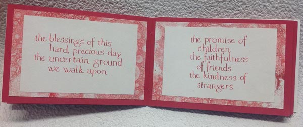 TITLE: Mini Book - YT5 - Red Arches Text Wove for the hand written text written with a pointed pen or a 2.4 Parallel pen in a Foundational style lettering using Holbien gouache " Flame Red". These pages adhered to a decorative layered Geli print on Text Wove using Golden's Fluid Acrylic "Quinacridone Red" & "Iridescent Bright Gold". A stencil used to add the dotted design. This was then adhered to the Canson Ingres (red) pages. The book cover and box made from Stonehenge white heavy weight paper and embellished with the Ingres and decorative papers. The book is 6"w x 4"h x 1"thk