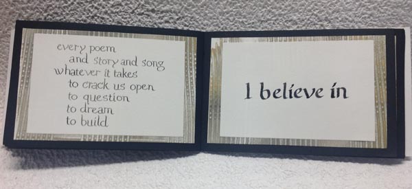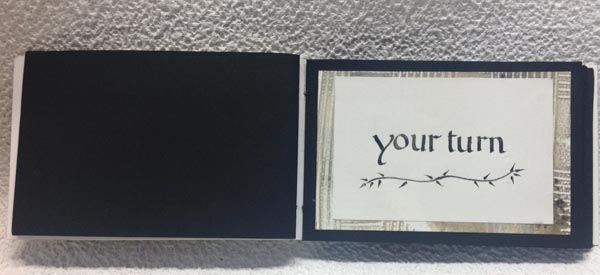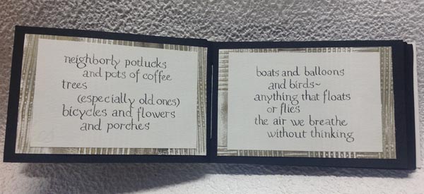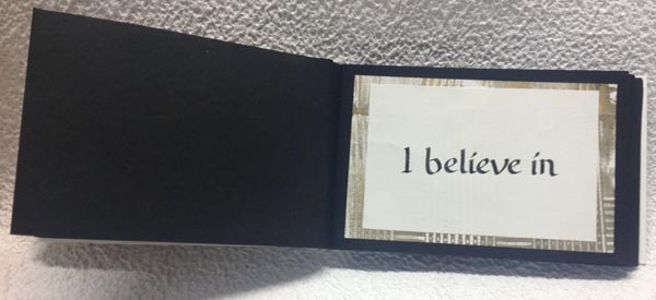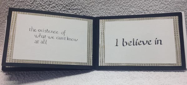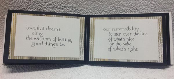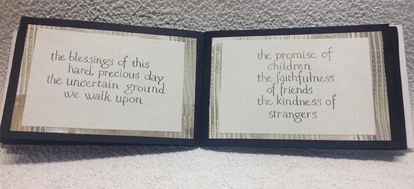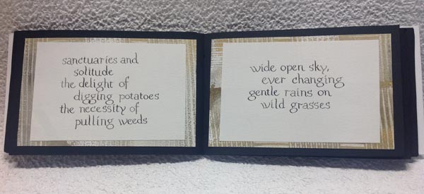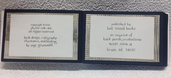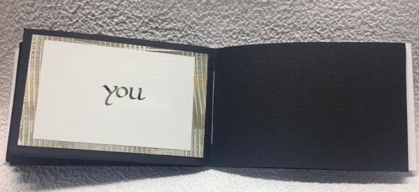 TITLE: Mini Book - YT7 - Black/Gold Arches Text Wove for the hand written text written with a pointed pen or a 2.4 Parallel pen in a Foundational style lettering using Sumi Ink and Schminke gold powder. These pages adhered to a decorative layered Geli print on Text Wove using Golden "Iridescent Bronze Gold", Folk Art "Metallic Sequin Black". A texturing tool used for the design. This was then adhered to the Canson Ingres (black) pages. The book cover and box made from Stonehenge white heavy weight paper and embellished with the Ingres and decorative papers. The book is 6"w x 4"h x 1"thk