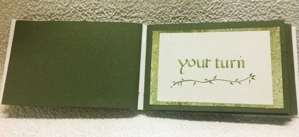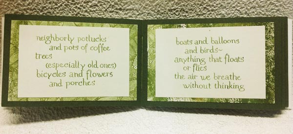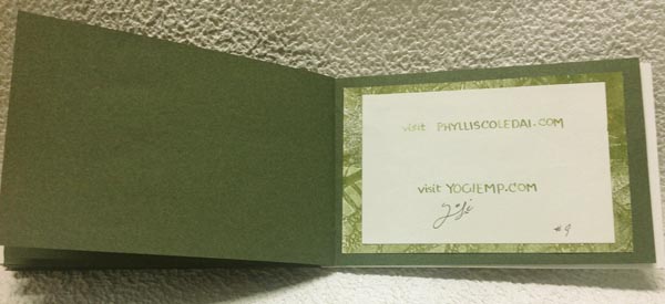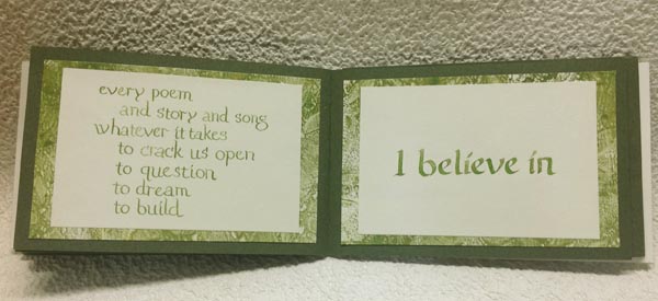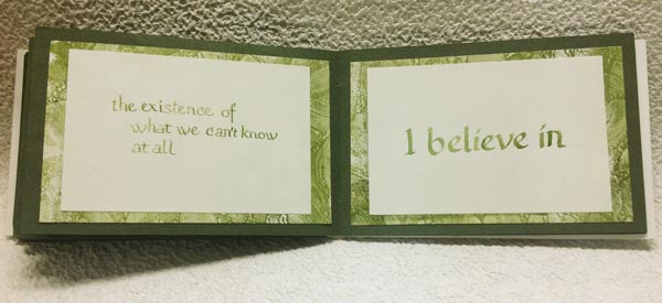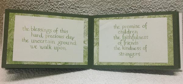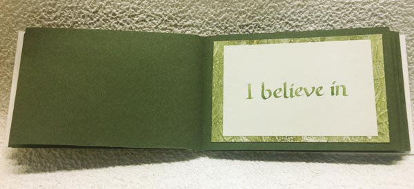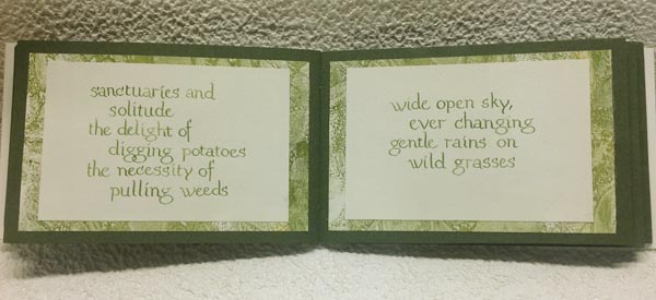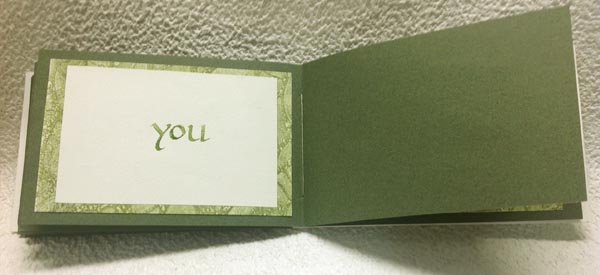 TITLE: Mini Book - YT9 - Green/Gold Arches Text Wove for the hand written text written with a pointed pen or a 2.4 Parallel pen in a Foundational style lettering using Holbien "Prussian Blue" and "Olive Green" gouache with Schminke gold powder. These pages adhered to a decorative layered Geli print on Text Wove using olive green acrylic paint. Stencilled the design using a leaf stencil. This was then adhered to the Canson Ingres (green) pages. The book cover and box made from Stonehenge white heavy weight paper and embellished with the Ingres and decorative papers. The book is 6"w x 4"h x 1"thk
