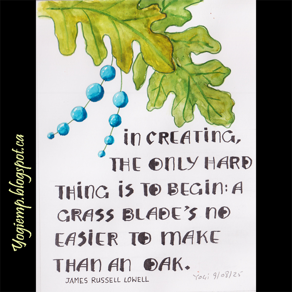 size: 4.5"w x 6"h I saw some oak leaves and the rest evolved. On Canson XL Pen & Ink paper drew out my leaves and bal shapes... Painted with various brands of w/c. Added white gel pen highlights Calligraphy with a green .5mm Zig Calligraphy pen in a funky style words: In creating the only hard thing is to begin: a grass blade's no easier to make than an oak. James Russell Lowell