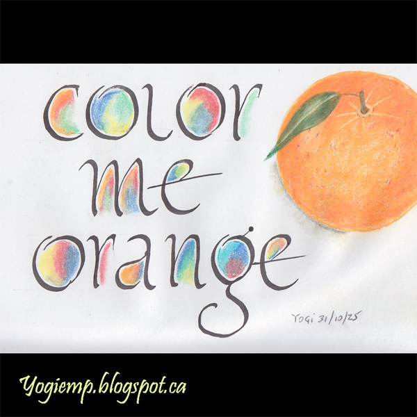 size: 2.25"h x 3.5"w I came across something in my stash while I was looking for something else... I didn't have a date on it so have no idea when I actually created it... but it must have been eons ago since I don't remember it. Anyway liked it so created this piece. On Canson Pen & Ink paper kind of drew out the letters then went over them with a ZIG Calligraphy marker (small edge). Colored the internal areas using Prisma colored pencils. Then decided to add the image of an orange. I'm pleased with the results. words: Color Me Orange