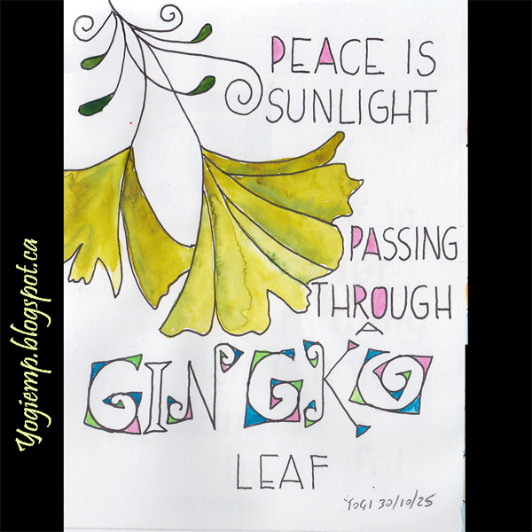 size: 6"h x 4.5"w On Canson Pen & Ink paper drew out the gingko leaf & painted with w/c. Wrote out the funky lettering for "Gingko" and monoline for the rest adding w/c accents... words: Peace is sunlight passing through a gingko leaf