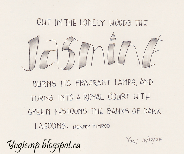 size: 7"w x 5.5"h On Genoa Bond Calligraphy paper wrote out the word "Jasmine" using a Caran d'Ache Grafwood F pencil and paper stump in a funky style. The rest of the text with a Juice Up pen in monoline. words: Out in the lonely woods the Jasmine burns its fragrant lamps, and turns into a royal court with green festoons the banks of dark lagoons. Henry Timrod