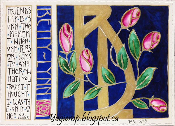 ID: Postcard - Betty-Lynn #140 Arches Hot Press watercolor paper. Monoline letter painted with Ecoline Gold, when dry over painted with Twinkles H2º gold. Everything outlined with the Ecoline gold and a pointed pen. After painting went over some of the lines with a gold gel pen... Background in full name done with Twinkles H2º. Background in monoline letter done with Winsor Blue - Red Shade watercolor. Quote written with a black Micron .02 pen. Dots between words done with a gel pen (Sakura Metallic Blue) Words: Friendship is born the moment when one person says to another "What! You too! I thought I was the only one." CS Lewis Adhered to the Neenah cardstock.