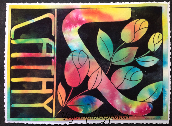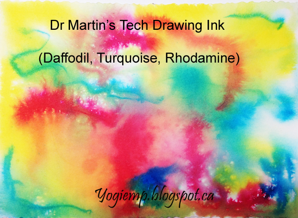 ID: Postcard - Cathy Bauer Arches 140# HP Watercolor Paper. Paper sprayed generously with water and inks dropped in and allowed to do their thing... IDr Martins Tech Ink - Daffodil, Turquoise & Rhodamine. Lettering and artwork drawn in with a pencil then negative areas painted with QoR Paynes Gray. Adhered to the Neenah cardstock. |