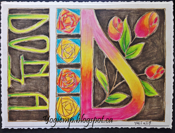 ID: Postcard - Barb Fuller I used one of the cut out's I made for Gemma's class using my electronic cutter and black cardstock. Backed it with an acrylic painted background that was pressed onto another glossy cardstock giving a mottled and textured look. The monoline letter was painted with Gansai Tambi Pearl Colors "Scarlet Red". But on black it was more of a pink. The leave were colored with Prisma colored pencils., The background of the letter with Gansai Tambi Starry Colors ""Blue Gold" The name was colored with Prisma colored pencils. Adhered to the Neenah cardstock.