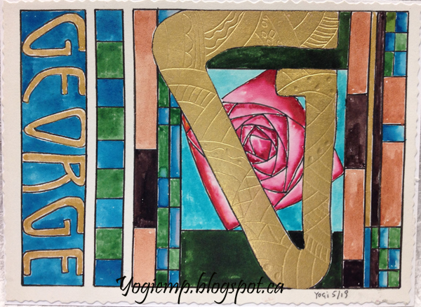 ID: Postcard - George Huitema #140 Arches Hot Press watercolor paper. Monoline letter painted with Twinkles H2º gold paint, when dry applied Jerry Tresser adhesive. When dry applied Robertson's 23.75kt gold leaf and tooled it. Everything was inked with a black Zig Writer, then painted with the Twinkles H2º. Adhered to the Neenah cardstock.