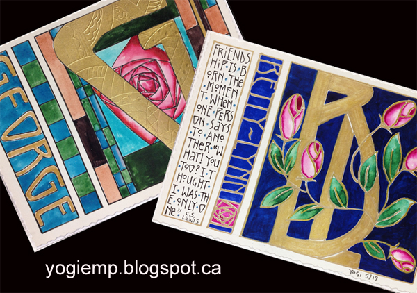 ID: Postcard - Thea Paul #110 Neenah cardstock. Monoline letter and name done with Cornelissen 85 "Standard Gold 22 KT". I used Jerry Tresser pink adhesive. Not my best gold leaf application, but I haven't done it in a few years...so will have to practice a bit. BIG GRIN. All paints are by Holbein. Flowers painted with "Opera" (love this color). Leaves with "Permanent Green" and background with "Peacock Blue". Full intensity on the right side, a pale version in the center area and a mid tone on the left side. Adhered to the Neenah cardstock. |