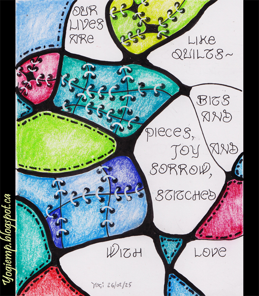 27, 2025 size: 4.5"w x 6"h Just doodling away... Done on Canson Pen & Ink paper. ZIG Writer, Prisma colored pencils, Unibal white gel pen and Juice Up for the text. Funky lettering "Art Nouveau" style. words: Our