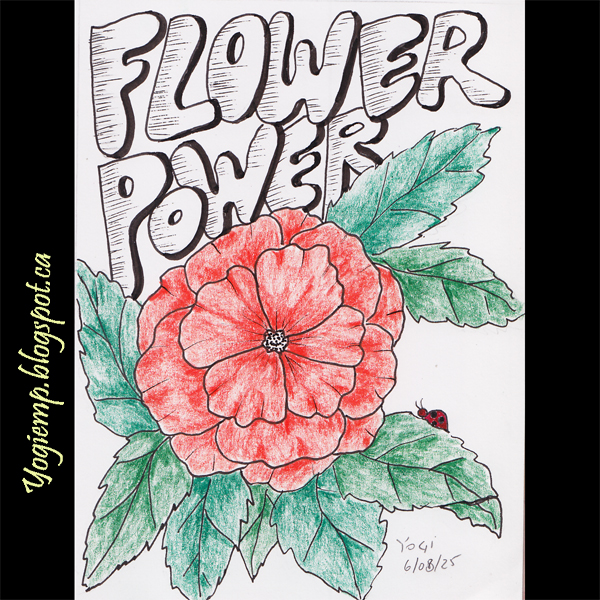 size: 4.5"w x 6"h Another piece done while playing with the gals On Canson XL Pen & Ink paper drew out my flower and colored with Prisma Colored pencils. Added the word FLOWER POWER and hatched with a Juice Up pen. words: Flower Power |