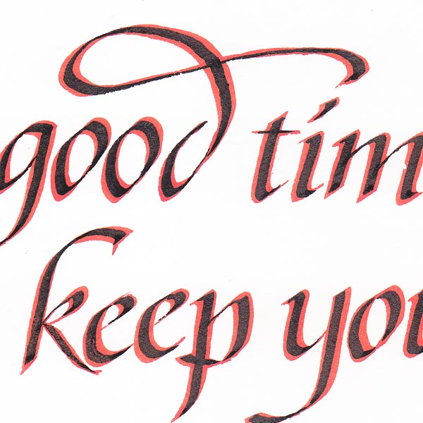 - Practice - Aphorism - A Good Time on genoa bond calligraphy paper, 4.5 and 2.4 Parallel pens, Vermillion and Black Sumi ink in Italic with flourishes. Still practicing both... Normally Italic is 5PW h. I did mine approx 3.5PW h for the 4.5pen, 1st doing the Vermillion, when dry with the black.