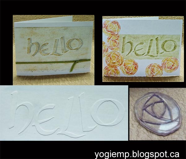 ID: Wk 17- Impressions - Hello cards I wrote out the word "HELLO" in an Uncial style, cut it out and adhered it to another piece of cardstock. Ran it through it my embossing machine with Arches Text Wove then hit the high points and the rest of the paper with Distress ink pads. Adhered to a card base and added a ribbon. For the 2nd card I also cut out a Deco Rose from my clear rubber. Inked the stamp with a yellow and red Distress pad, misted lightly with water and stamped, repeating for all the roses. |