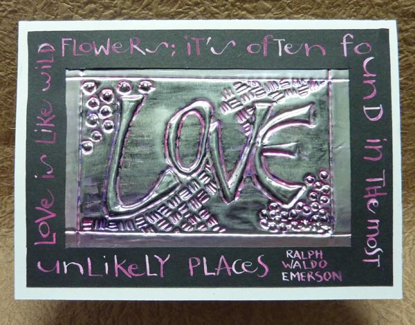 ID: Wk 17- Impressions - Metal Love card Size: each card - 6"w x 4.5"h Tooled a piece of metal both on the front and back. Applied alcohol ink using a Kurecolor Alcohol Based Dyestuff ink in pink, rubbed some off then applied Kuretake Fude brush ink. Rubbed that lightly as well. Adhered to my white cardstock base. Cut a frame from black cardstock and wrote the quote using a pointed nib and Holbien gouache, a mix of Permanent white and Opera Pink. Quote: Love is like wildflowers; it's often found in the most unlikely places. Ralph Waldo Emerson |