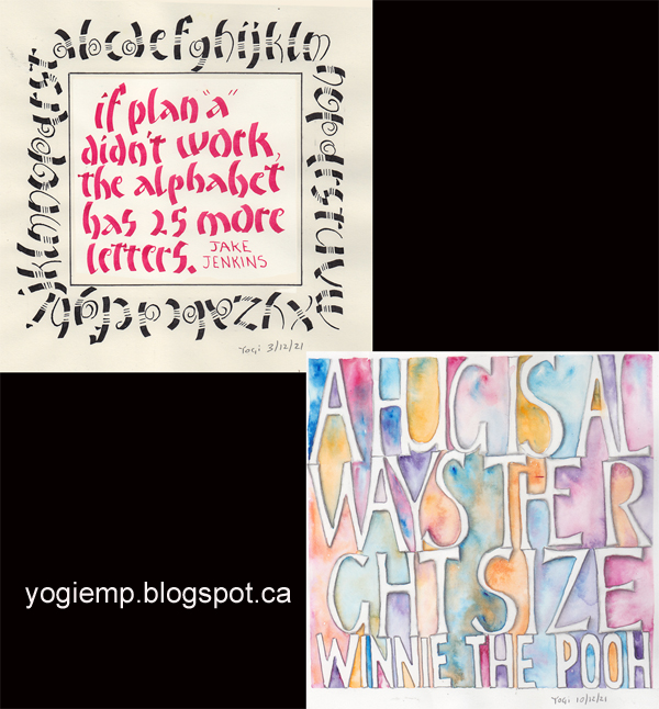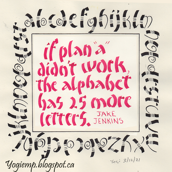 ID: wk 48 - A-Z - If Plan A Edmonton Calligraphy Society hosted Carrie Imai teaching Carrie's style of lettering "Carrioka on ZOOM. Wonderful session. I decided to use the technique for my Scribbled Lives challenge this week... On Genoa bond paper wrote in the quote using Ecoline "Carmine" ink and a 3.0 Parallel pen. Did the outside border with Sumi ink adding a striped pattern in the letters. |
