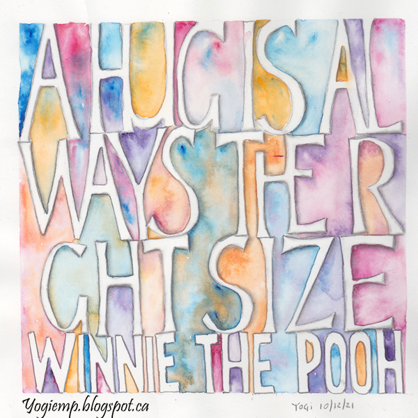 ID: Wk 49 - Winnie The Pooh - A Hug Size: 7" sq On Arches 90# HP watercolor paper lightly penciled in my letters then painted by dropping in QoR watercolors. Added graphite shading using Carn d'Ache 5B pencil and paper stump. Words: A hug is always the right size. |