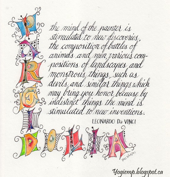 ID: wk 26 - Pareidolia - Da Vinci On Bee Super Deluxe paper, pointed pen and Sumi ink in a script type style wrote out the quote. Drew my decorated letters, outline and doodlig with a Micron pen and colored with QoR watercolors and Derwent Inktense w/c pencils. |