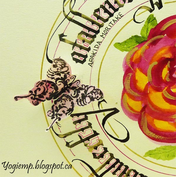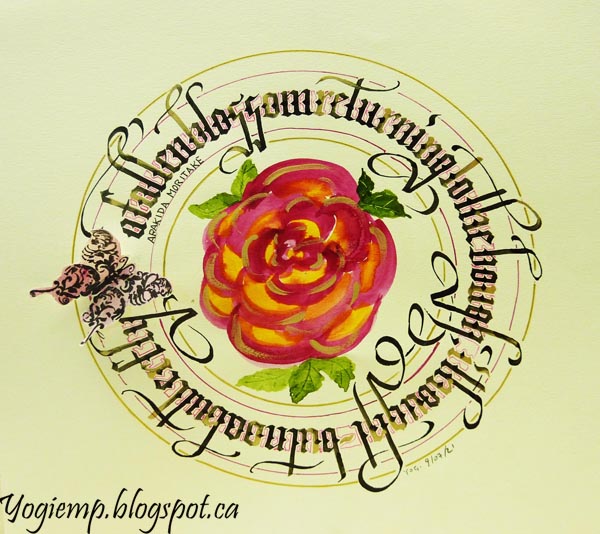 ID: Wk 27 - Flowers - A Fallen Blossom I've always been fascinated by Blackletter and circle formats... Tamer Ghoneim does fabulous calligraphy and he had a ZOOM free class yesterday (July 8/21) where he showed his process for creating circular artwork. Picked up quite a few tricks. Circle size, I'm still doing my way. I write out the quote, using the pen size and lettering style I will use on the final piece (doesn't have to be extremely neat...). Measure it and do a radius calculation. (C=2πR). If the length (circumference) of my work is 15", (π= 3.14) so 2π = 6.28. Divide 6.28 into your circumference of 15" and you get basically a radius of 2.4". Now you can draw your various circles. Put a pencil mark where you want the center of your circle and draw your first circle which is your base line. Then draw all the other circles. I used an EK Success Orbit Circle Scissor (sorry it's discontinued, but there are many other brands and style out there. I find the ruler type where you hold the center point is not very good for me - it always moves... I used Bee Super Deluxe paper, drew my circles and did my lettering with a 2.4 Parallel pen filled with Sumi ink, double dipped into Ecoline Gold. Detail in between the letters with Holbien Opera Pink gouache and a fine tipped nib (Gillot). Drew the extra circles with a Gold gel pen and a pink Zig Writer. Painted the flower with QoR watercolors accenting with the gold ink. The butterfly (Flourishes) stamped with Versa Clair ink and hand cut. Quote: A fallen blossom returning to the bough, I thought - but no a butterfly. Arakida Moretake |
