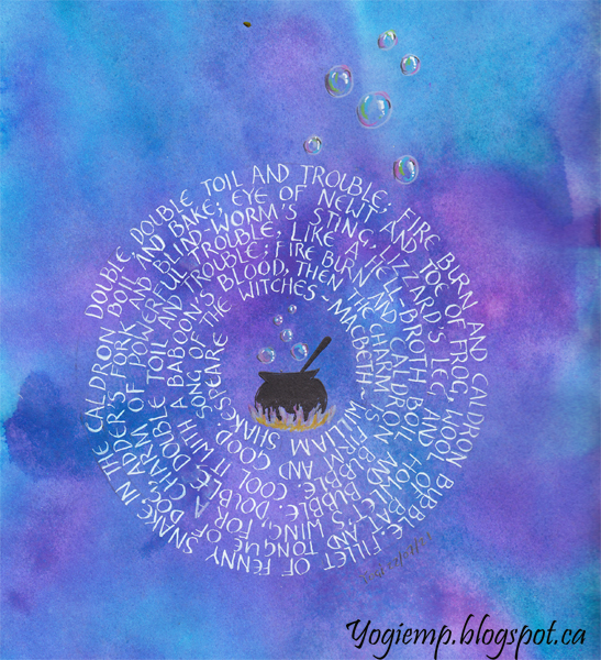 Trouble Size: 7"w x 9"h On Bee Super Deluxe paper. Wet the paper and sprayed with Dylusions "Calypso Teal" and "Crushed Grape". Let dry. Wrote out the quote using a pointed nib and Holbein "Permanent White" gouache in a monoline style. Created the caldron and bubbles with colored pencils. |