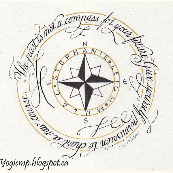 not On Bee Super Deluxe paper, drew my circle and wrote out the circles with a pointed nib in a Copperplate style with Sumi ink. Added the flourishes and the gold pen circles and design element. Quote: The past is not a compass for your future. Give yourself the permission to chart a new course. Stephanie Leigh Mulac |