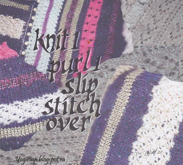 Knit 1 Purl 1 I took a photo of a couple of my hand knit sweaters. Created the background in Photo Shop and then printed out on copy paper. Wrote in my words using a 4.5 Parallel pen and Sumi ink in a Bone Script style. Shadowed with Holbien Permanent White gouache. |