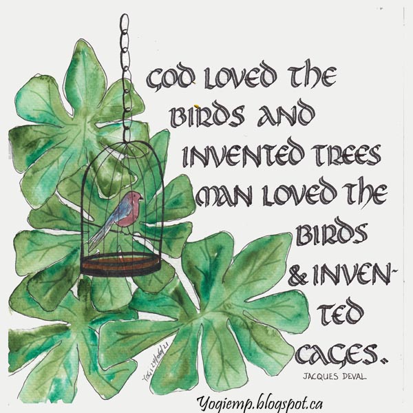 ID: Wk 25 - Birds - Jacques Deval Size: 8" sq On Fabriano CP #1264 pad, drew my design with a Micron pen then painted with Winsor & Newton watercolors. My normal scroll pen was too wide so I took a Zig Calligraphy Pen 3.0 and cut a grove in the tip... I think I'll do a bunch of pens like this... wrote out the quote in an Uncial style. Quote: God loved the birds and invented trees. Man loved the birds and invented cages. Jacques Deval |
