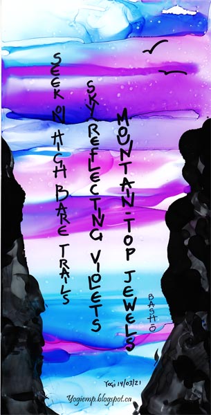 ID: Wk 10 - Spring - Bashō On Grafix white opaque Craft Plastic applied my alcohol inks (Copic Holiday Blue, Ultramarine and Adirondack Raspberry), dropped in a lot of 99% alcohol and tilted and shifted my paper to get a nice sky effect... When dry added the Adirondack Pitch Black on either sides and moved it around with a palette knife to get a craggy mountain effect. When dry used a Sharpie fine point to write out the text. The added a couple birds in the sky... Haiku: Seek on high bare