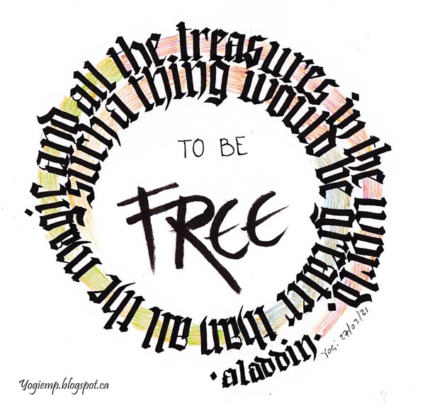 ID: wk 12 - Aladdin -To Be Free On 110#Staples white cardstock drew my circles and wrote the quote with a 3.0 Parallel pen and Sumi ink in Blackletter style. Colored in the negative areas. Wrote the word "Free" with a Pentel Color brush pen