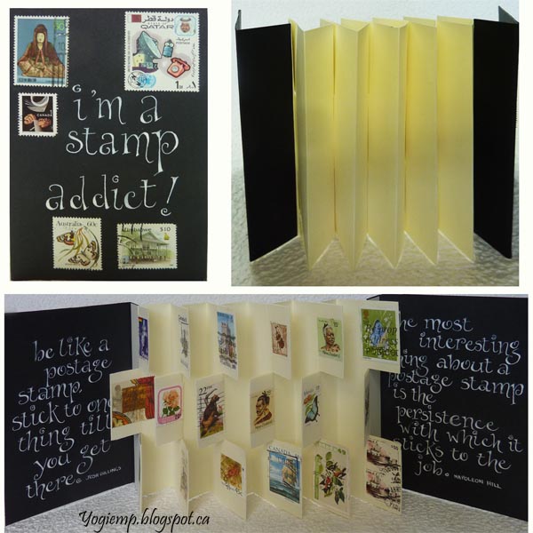 open) I'm an addict when it comes to postage stamps... I usually buy the newest Canadian stamps when they are issued including the souvenir sheets... I will never use them all in my life time... but I love having the choices when I'm designing an envelope or something. The only stamps I stay away from are SPORTS. ugh. This binder holds hundreds and hundreds of usable stamps. I'm using Columbia Mills LBS End Paper, which folds nicely, has a good weight and is sturdy. My folds are 2" making it a 1" loop flap. I used an unknown black cardstock for the covers. My text and quotes are written with a Nikko G nib and Holbien "Permanent White" gouache. On the cover: I am an addict Inside left side: Be like a postage stamp, stick to one thing till you get there. Josh Billings Inside Right Side: The most interesting thing about a postage stamp is the persistence with which it sticks to the job. Napoleon Hill |