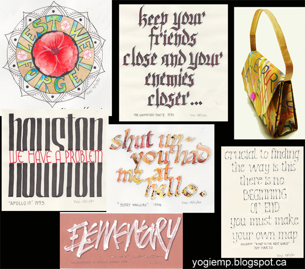 ID: Wk 46 - Movie One Liners - Shut Up On Arches 90# HP watercolor paper, sprinkled with Bister powders (Yellow, Red & Brown) and using a 6.0 Parallel pen and water wrote out the one liner. Shadowed with an Caran d'Ache graphite pencil and paper stump. |