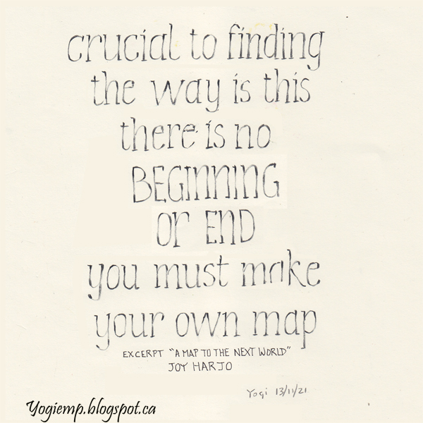 Map I thought I'd keep this very simple... On Genoa bond paper and using a Prisma colored Pencil (Cool Grey 90%) in a pressure release Bookhand style lettering wrote out a portion of the poem. Excerpt: Crucial to finding the way is this there is no beginning or end you must make your own map. "A Map to the Next World" |