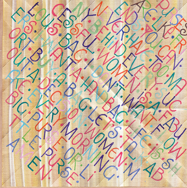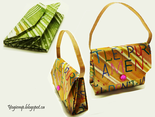 ID: Wk 47 - Purse - quotes The small green clutch was done with a geli print on Arches text wove paper. The handbag was done on pearlized text weight paper painted with acrylics. Various quotes written in monoline using Artistro Extra Fine tipped acrylic pens. Each bag done with a 6" square piece of paper and the finished bag size is 2"w x 1.5"h x .5" w at the base. I added a piece of Velcro to hold the flap closed and a decorative pink rhinestone. uTube instructions: https://www.youtube.com/watch?v=ZvrU8mJbWJ4