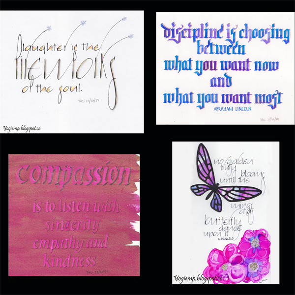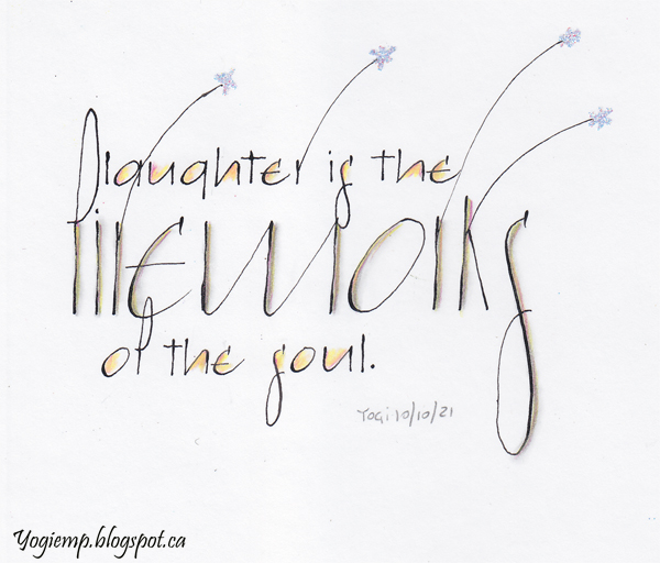 ID: wk 40 - Fireworks - Laughter I was introduced to Gwen "Weaver writing" this week by Bill Kemp hosted by the Edmonton Calligraphy Society. I really like the writing but would probably make some changes eventually... Thought I would practice... On Staples 110# white cardstock wrote out the words in various sizes with a pointed pen and Sumi ink. Prisma colored pencil accents in the smaller letters (yellow and a pink) blended with a Splendor Blender. On the larger lettes=rs added graphite shading and paper stump blending then added strokes of the yellow and pink. Words: Laughter is the fireworks of the soul. |