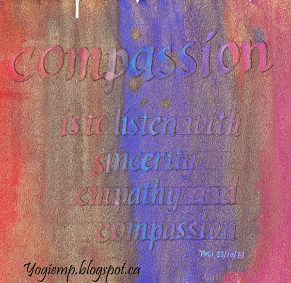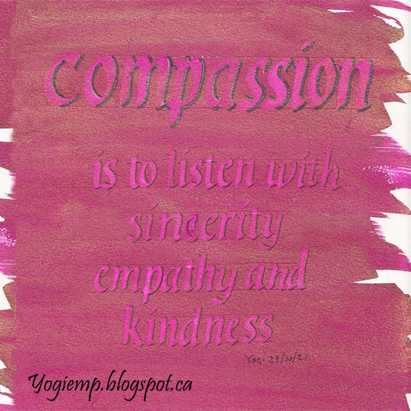 Compassion On Arches Text Wove paper, painted with a large brush de Atrementis ink (Magenta Red/Gold). Let dry then scribed with a 6.0 Parallel pen for the main word and 3.0 Parallel pen for the rest dipping into water and blotting to lift the ink repeatedly... Shadowed with a black Zig Writer. The image below is the one I like better but I made a goof on it - sigh. (I used the Magenta, Cyan Blue/Copper & Carnelian Red/gold). I like the vertical stripes better as well. Words: Compassion is to listen with sincerity empathy and kindness.