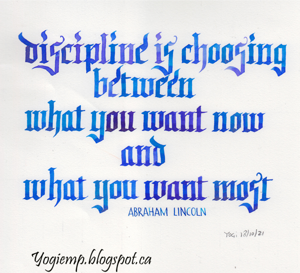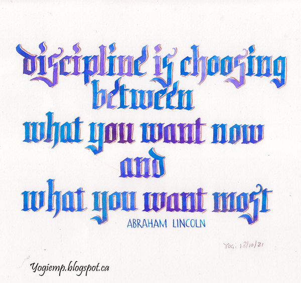 Over Most On Arches 90# HP watercolor paper and using a 3.0 parallel pen with Atramentis Pearlescent ink "Cyan Blue-Copper" with a touch of "Magenta Red-Gold" in Blackletter style. With a Pointed pen and Finetec "Bronze Original" shadowed the letters. Quote: Discipline is choosing between what you want now and what you want most. Abraham Lincoln