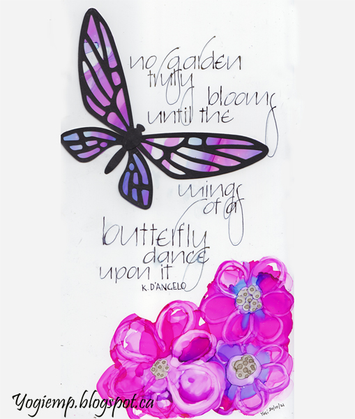 ID: Wk 43 Wings - No Garden Size: 6"w x 11"h On Opaque White Craft Plastic (shiny side) Created the flowers on the bottom with "T Rex Inks" (alcohol inks). The butterfly (Tim Holtz Bigz "Fanciful Flight") was die cut from a scrap alcohol background and black cardstock. Weaver lettering with a Nikko G nib and deAtramentis Pearlescent "Indian Blue - Gold" ink Bummer you can't see the gold in the ink in the photo... |