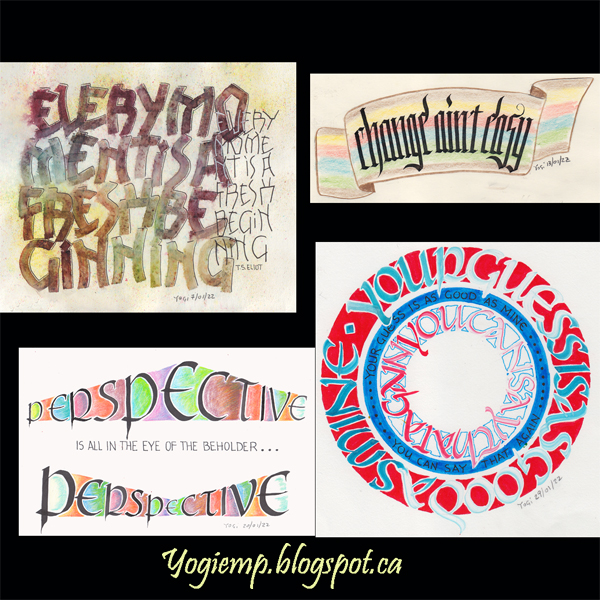 Easy Apparently there's a website that creates an exercise for you... LetteringMaker.com Using the criteria I decided on a ribbon format for the Logotype. Used a 3.0 Parallel pen and Sumi ink. Then drew my ribbon around it and colored with Prisma colored pencils - the 70's using bright green, turquoise, sunshine yellow, orange and brown.