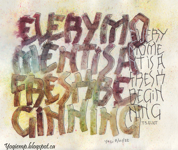 ID: "wk 1 - "Begin" On Bee Super Deluxe paper, sprinkled Bister powders (red, yellow, blue and brown) and with a 6.0 Parallel pen dipped in water wrote out the quote in Liesbet's "Zeep" style of writing. Shadowed letters with a .02 Micron pen. When dry, misted with water and wrote out the quote agin with a Zig Writer and some Bleed Proof white ink. Words: Every moment is a fresh beginning. TS Eliot |