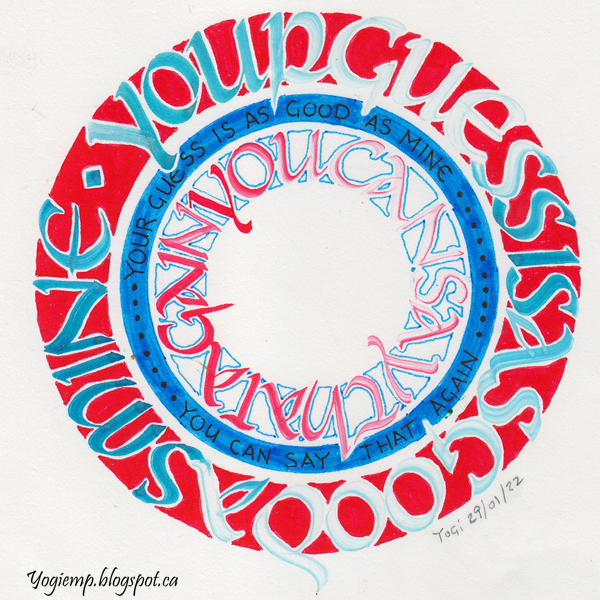 Your Guess I was in mood to do a circle piece and I thought to use Uncial instead of my normal Blackletter style... I'm also using a technique I came across through Annette Wichmann from Kensington Art Supply, by @DanaPiazza who double loads his color by dropping ink into the small hole in the nib area... On Arches 90# HP w/c paper drew my circles with a Helix Circle Ruler. Used a 2.4 and 3.8 Parallel pen. Outer layer with deAtrmantis ink "Cyan blue" dropping in Rapidograph "White" waterproof ink. Filled in the negative spaces with a red Tombow marker. Inside layer with Pilot Red and the Rapidograph white ink. Outlined with a blue Tombow marker. Middle layer with the blue Tombow marker and lettered with a .05 Micron pen. |
