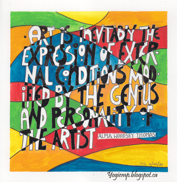 Thomas - Art Is Inevitably On Master Choice watercolor paper (I think140#) Drew my letters, outlined them with a .08Micron pen, then added the wavy lines dissecting everything... Painted the background with watercolors and the letters with a black Glaze pen in a harlequin style... words: Art is inevitably the expression of external conditions modified by the genius and personality of the artist. Alma Woodsey Thomas |
