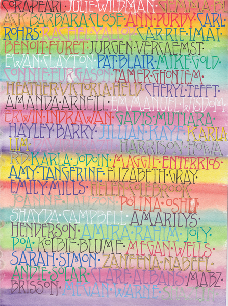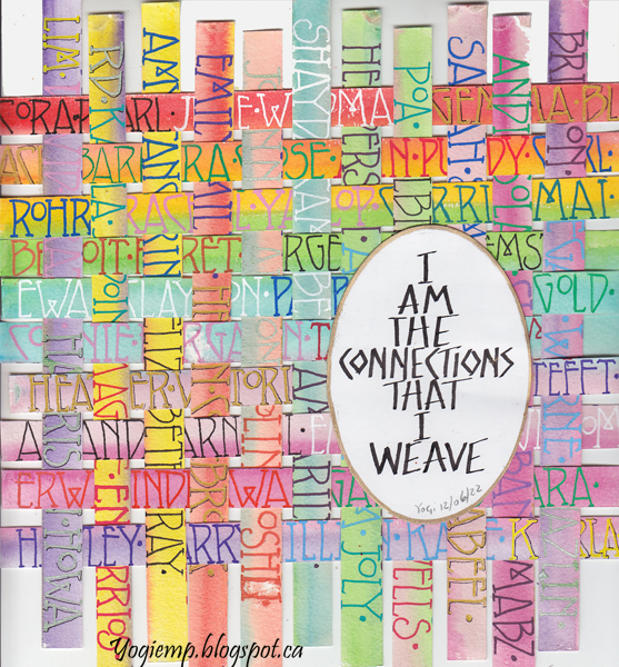 - I Am The Connections On Arches Text Wove paper painted my colored stripes using mainly Winsor and Newton watercolors. Wrote in the names of a lot of my instructors since Covid started (still a bunch more I haven't included...) using various colors of Artistro extra fine tipped pens, gold and white gel pens and microns in an architectural hand.. Cut down to 1/2" strips and wove. Wrote out the quote with a 1.5 Parallel pen and Sumi ink. Die cut with a Spellbinders oval die set, edged the oval with a gold Krylon pen and adhered to weave. |