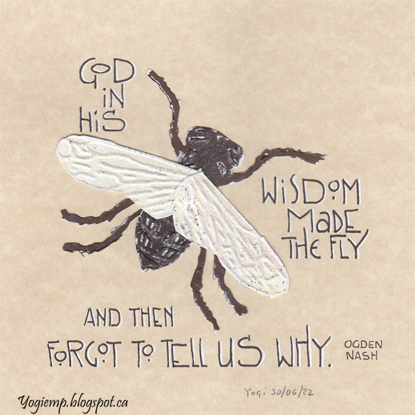 - Ogden Nash - Made The Fly On parchment "Tan" scrapbook cardstock wrote the quote using a Micron .08 pen and shadowing with Bleed Proof white ink. The fly is a reshaped "Bee" Bigz die from Tim Holtz. Wings embossed with "Psychedelic" embossing powder. Words: God in his wisdom made the fly and then forgot to tell us why. Ogden Nash |