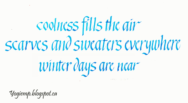 Winter Days On Bee Super Deluxe paper wrote out the haiku using a 2.4 Parallel Pen and deAtramantis Pearlescent ink "Cyan Blue - Copper" in Gothicized Italic. I definitely need more practice... there are too many areas I'm not happy with, but this was about my 5th time writing out the haiku... I found this Haiku but changed the last line... Words: Coolness fills the air