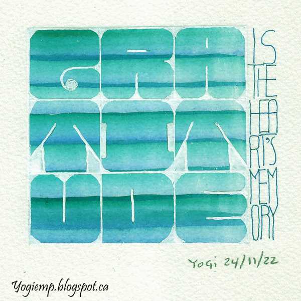 Heart's Memory On Fabriano w/c paper Painted the lettering area with a double loaded chisel brush, then with Bleed Proof White created the letters in an Art Nouveau style. Added the monoline lettering with a Pilot Juice Up dark blue pen. Words: Gratitude is the heart's memory. |
