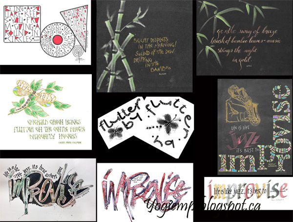Is Like Jazz #4 Couldn't resist doing another one in the style of Nancy Hayes Hill... On New Page Sterling Premium Digital 100# Glossy cardstock wrote out the word "improvise" sprinkling Bister powder onto my cardstock using a Glitter Duster (yellow, red, green and blue) and a Dreaming Dog "Leeloo" ruling pen filled with water. When dry filled in the negative spaces with a Pentel Pocket pen, then added gold gel pen doodles. Wrote in the text with a 1.5 Parallel pen and Sumi ink.