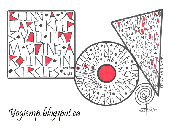 Being A Square Interesting reading "Signs Of Life" by Angeles Arrien. I read a small excerpt onLine. Makes me wonder about my choices and the size and positioning of them... I drew my shapes with a black Zig Writer on white 110# Staples cardstock. Wrote in my quotes in various monoline styles. I added red around the dots in the circle quote to show the cross over from one circle to the next. Then decided to color the center circle using a Pentel Color Brush... then said I needed some in the other two shapes... Quotes: Being a square keeps you from going around in circles. J, Vernon McGee Life is a full circle widening until it joins the circle of motions of the infinite. Anais Nin Love is made up of 3 unconditional properties in equal measures: 1) acceptace 2) understanding 3) acceptance. Vera Nazarian |