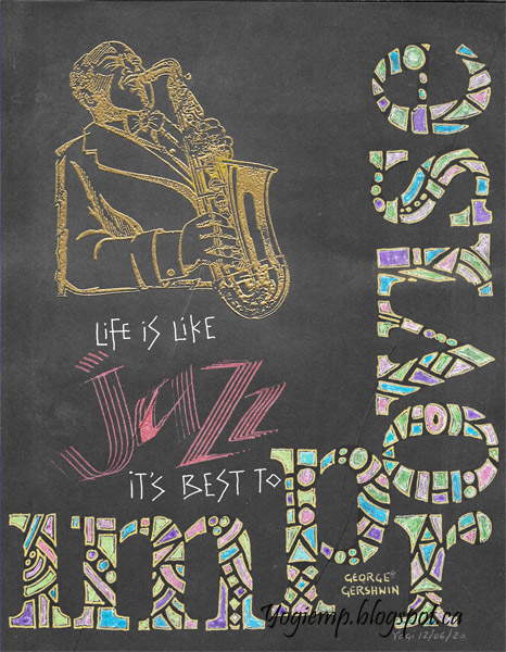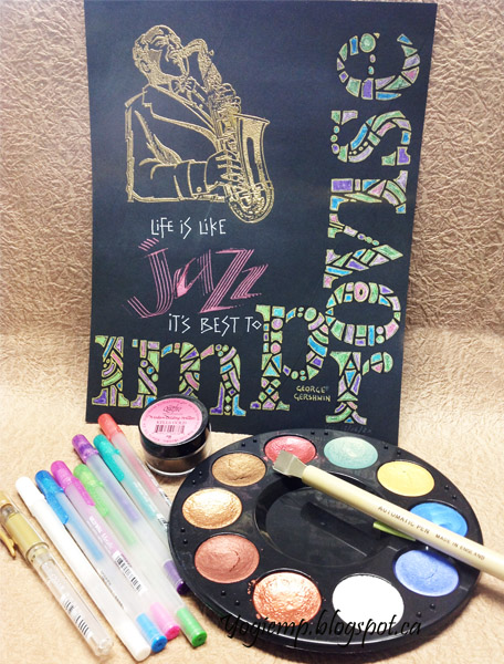 Quote - Life Is Like Jazz On black Recollections cardstock, stamped the Saxophone Musician (Rubbernecker) with Versafine Clair "Golden Meadow" stamp pad and heat embossed with Quietfire Design "Kell's Gold". Wrote part of my text with a Sakura Gelly Roll white gel pen. "Jazz" with the automatic pen from England and US Artquest Mica Color Metallic "Super Russet". "Improvise" with Versafine Clair "Nocturne" stamp pad and Words & Crafts Magnetic Poetry Big Lower Case letters. Then drew my decorative shapes with a Uniball Signo gold gel pen. Colored each interior shape with the white gel pen and then with various colors of Sakura Metallic Gelly Roll pens.