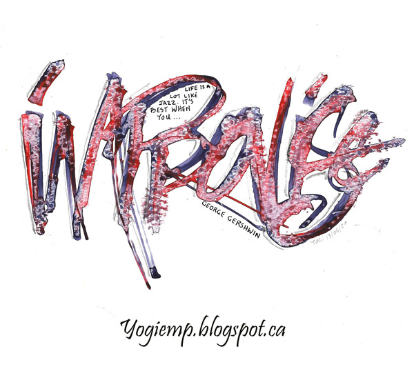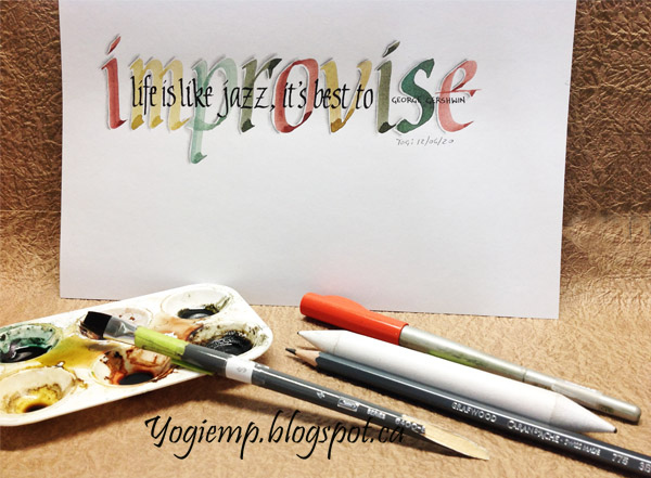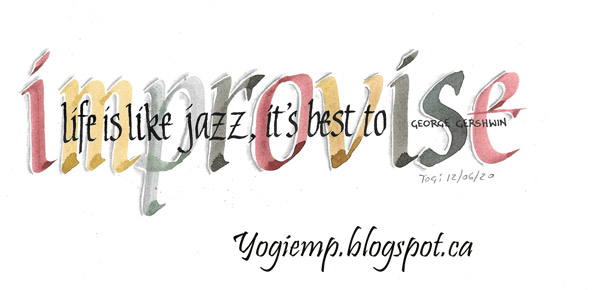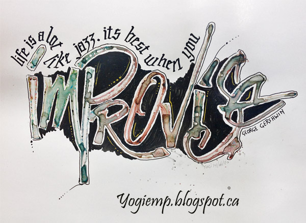 Is Like Jazz #2 On white Staples 110# cardstock wrote out the word "Improvise" with various colors of Bister ink and a flat edge #4 brush. Rest of the text with a 1.5mm Parallel Pen and Sumi ink. Shadowed with a Caran d'Ache graphite pencil #3B and blended with a paper stump.