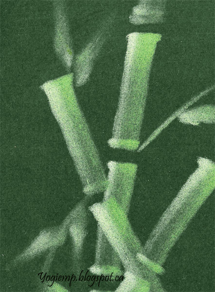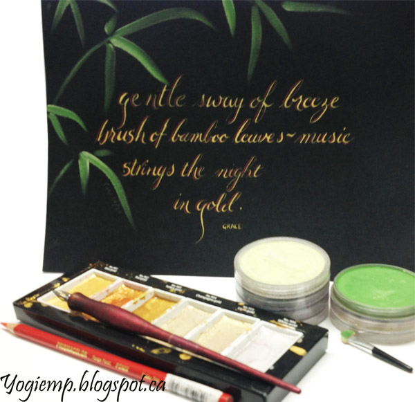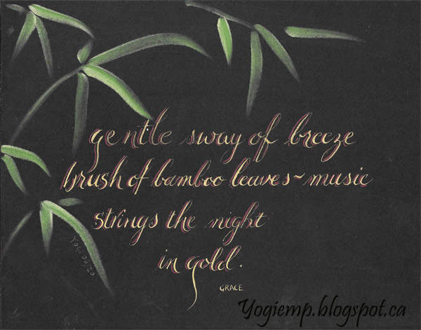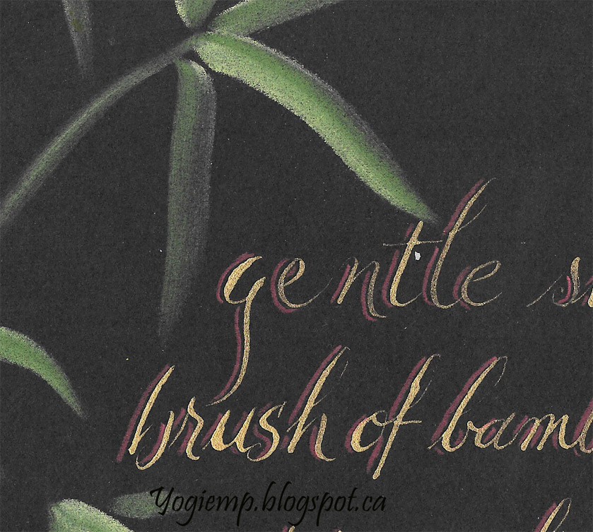 ID: Wk 25 - Haiku - Gentle Sway Of Breeze On black Recollection cardstock painted my bamboo using Pan Pastels (Bright Yellow Green Tint and Chromium Oxide Green) double loaded using the little triangular makeup sponge tool. Text written with a Zebra G nib and Gansai Tambi Starry Colors "Blue Gold". Shadowed with a red Prisma Colored Pencil. |