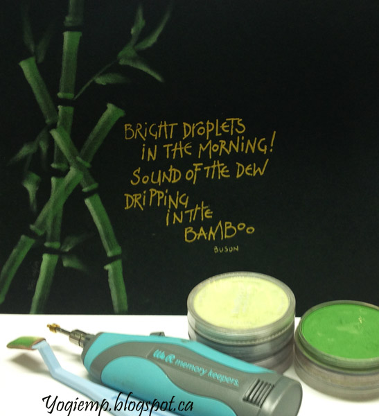 ID: Wk 25 - Bright Droplets On black Recollection cardstock painted my bamboo using Pan Pastels (Bright Yellow Green Tint and Chromium Oxide Green) double loaded using the rectangle tool. Wrote my text on some plain paper and then using the We R Memory hot foiling tool and gold foil traced and transferred my text. This tool is not as great as my Staedtler hot foil tool... but they don't make them anymore sigh!! |