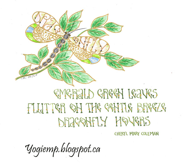 ID: Wk 25 - Haiku - Emerald Green Leaves Drew in the leaves and dragonfly with a Uniball Signo Gold gel pen on Staples 110# white cardstock. In the upper wings wrote out "Dragonfly" and added black dots with a Zig Writer. Colored with Prisma colored pencils. Wrote out the haiku with Holbein "Olive Green" gouache using a Zebra G nib in a lettering style I saw on Waltzing Matilda's website. Added gold gel pen dots to each letter. Haiku: Emerald Green Leaves ~ fluttering on the gentle breeze ~ dragonfly hovers. Cheryl Mary Coleman